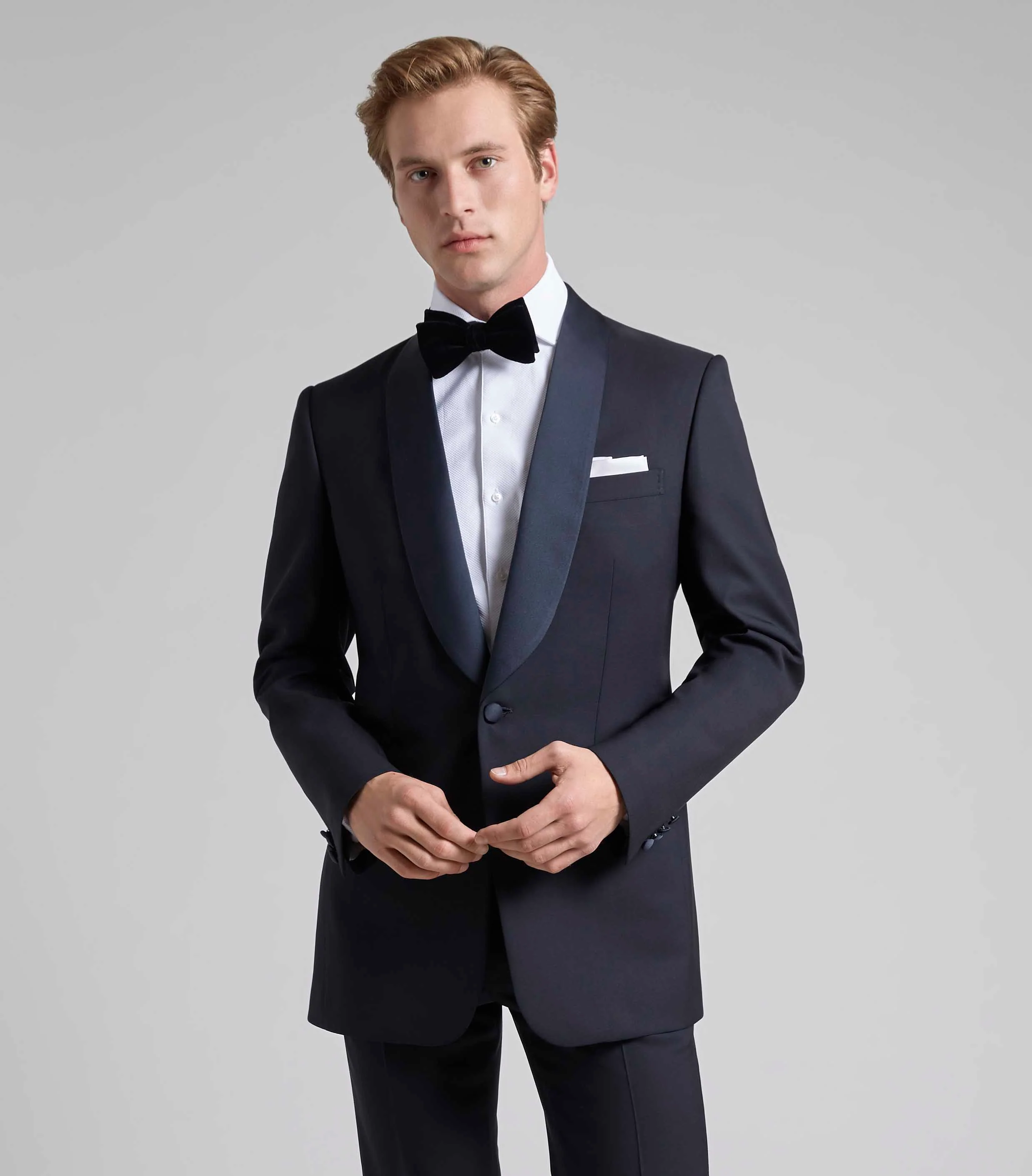 Cut from a medium-weight wool mohair blend to ensure crisp lines and a vintage twist, our classic dinner suit comes with a single satin-covered button, silk satin step lapel and straight jetted pockets. The trousers are kept simple with straight jetted side pockets, a handy right hip pocket and strap and buckle side adjusters for a clean, simple finish.